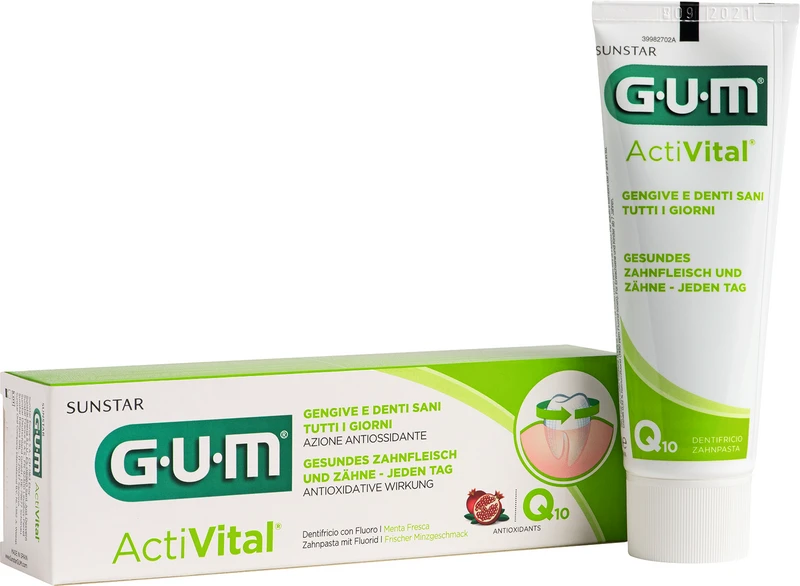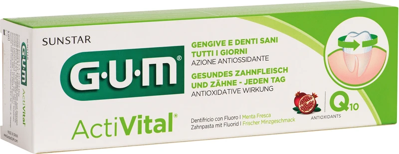 GUM® ActiVital® Zahnpasta Optimaler Schutz für Zähne und Zahnfleisch. Eine innovative Technologie für die tägliche Mundpflege. Langanhaltender Schutz vor Karies und Plaquebildung durch: Das innovative Antiplaque-System (Siliciumdioxid (und) Propyl-Steardimonium-Chlorid), das den bakteriellen Biofilm entfernt, ohne dabei die Mundflora zu beeinträchtigen; auch nicht bei langfristiger Anwendung. Kombination aus optimaler Fluoridmenge (1.450 ppm Natriumfluorid) und Isomalt, das die Fluoridaktivität für die Zahnschmelzremineralisierung verstärkt.