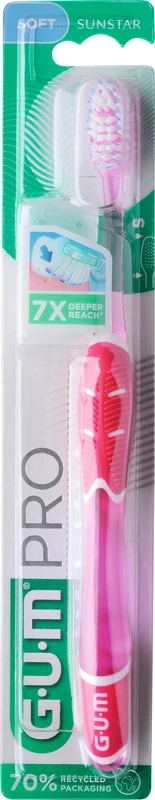 Die GUM® PRO Zahnbürste unterstützt Patienten mit Gingivitis/Parodontitis bei der gründlichen und schonenden Reinigung der schwer erreichbaren Stellen im Mund - entlang und unter dem Zahnfleischrand und am Interdentalraum. Der spezielle Quad-Grip Griff sorgt für den optimalen Reinigungswinkel von 45 Grad. Die mikrofeinen Borstenenden (0,01 mm) ermöglichen eine gründliche und schonende Plaqueentfernung unter dem Zahnfleischrand. Die Kombination von zwei verschiedenen Borsten (spitz zulaufend und zylindrisch) sowie die schrägstehenden Borsten ermöglichen eine klinisch geprüfte bessere Reinigungsleistung (vs. einer herkömmlichen Zahnbürste). Produkt-Highlights