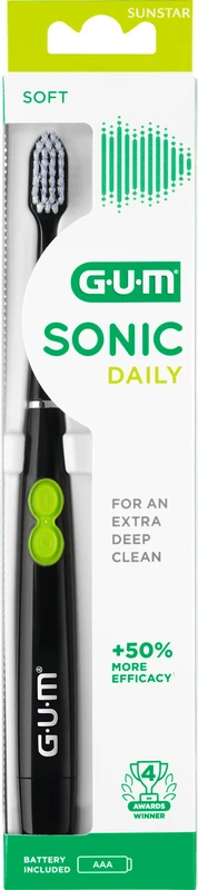 Die GUM Sonic Daily Schallzahnbürste nutzt innovative Technologien für eine bessere Plaque-Entfernung als mit einer herkömmlichen Handzahnbürste. Die mikrofeinen Borstenspitzen sind 50% effektiver beim Erreichen der Zahnzwischenräume und entfernen 47 mal mehr Plaque unter dem Zahnfleischrand (im Vergleich zu einer Handzahnbürste). Diese innovative Zahnbürste vibriert mit 12.000 Schwingungen/Minute um Ihre Zähne sanft zu reinigen und Ihr Zahnfleisch zu stimulieren.