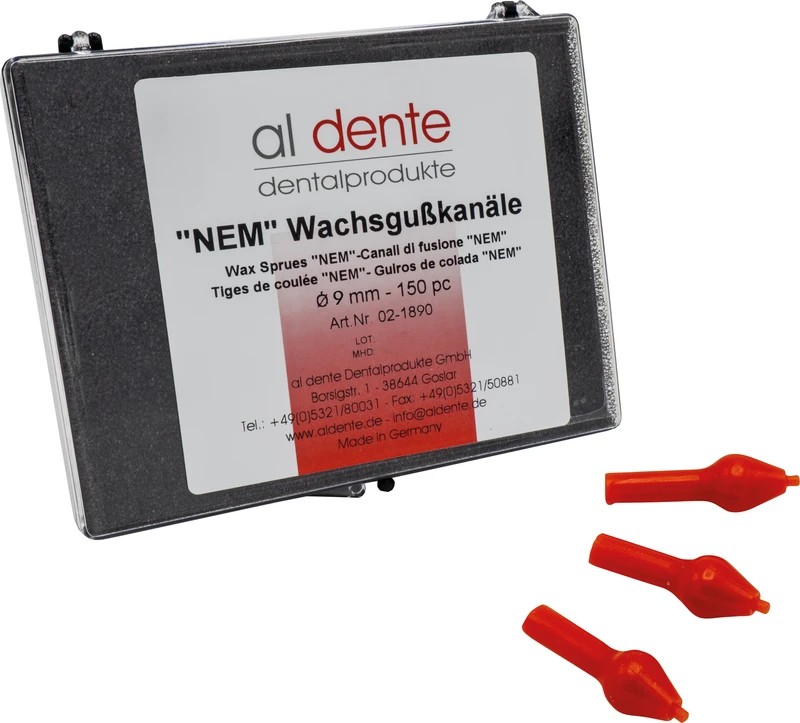 Strömungsgünstigste Form des Gusskanals. Das Ergebnis ist ein homogeneres Gussgefüge ohne Lunker. al dente Guss-Sticks EM mit Kopfdurchmesser 678 mm für Edelmetalllegierungen. al dente Guss-Sticks NEM mit Kopfdurchmesser 789 mm und vergrößertem Kanalquerschnitt speziell für Vakuumdruckguss sowie edelmetallreduzierte und NEM Legierungen.