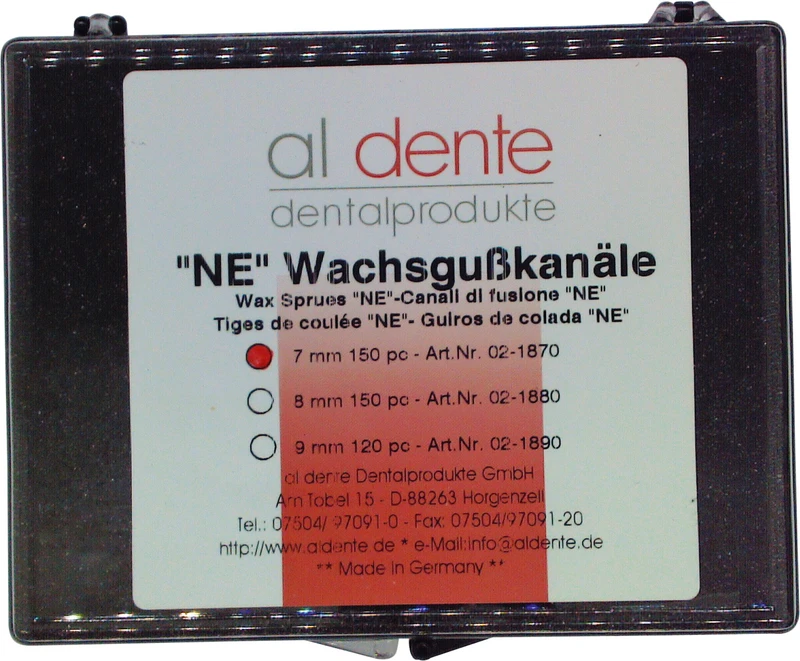 Strömungsgünstigste Form des Gusskanals. Das Ergebnis ist ein homogeneres Gussgefüge ohne Lunker. al dente Guss-Sticks EM mit Kopfdurchmesser 678 mm für Edelmetalllegierungen. al dente Guss-Sticks NEM mit Kopfdurchmesser 789 mm und vergrößertem Kanalquerschnitt speziell für Vakuumdruckguss sowie edelmetallreduzierte und NEM Legierungen.