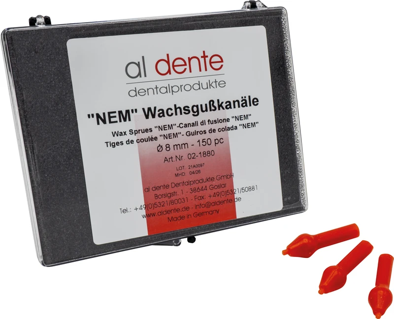 Strömungsgünstigste Form des Gusskanals. Das Ergebnis ist ein homogeneres Gussgefüge ohne Lunker. al dente Guss-Sticks EM mit Kopfdurchmesser 678 mm für Edelmetalllegierungen. al dente Guss-Sticks NEM mit Kopfdurchmesser 789 mm und vergrößertem Kanalquerschnitt speziell für Vakuumdruckguss sowie edelmetallreduzierte und NEM Legierungen.