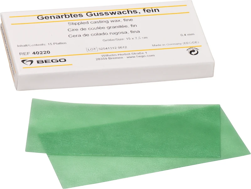 Bewährtes Wachs zum Modellieren von Modellgussbasen im OK-Bereich. Die Narbung gibt der Basis ein natürliches Aussehen und verbessert das Tastgefühl der Zunge. Läßt sich gut adaptieren und haftet ohne zusätzlichen Wachskleber fest auf dem Einbettmassemodell. Das genarbte Gusswachs steht in drei verschiedenen Oberflächenstrukturen fein bis grob zur Verfügung und ermöglicht die individuelle Oberflächengestaltung gemäß Behandlervorgabe. Die individuelle Narbung der gegossenen Modellgussbasis erleichtert das Fixieren der Speisen und schwächt das Fremdkörpergefühl für die Zunge des Patienten. Größe 15 x 7,5 cm.