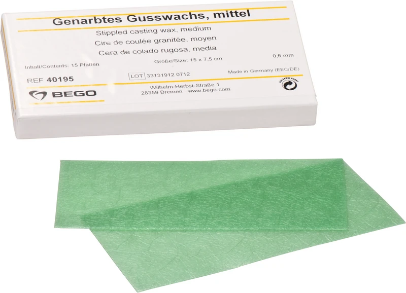 Bewährtes Wachs zum Modellieren von Modellgussbasen im OK-Bereich. Die Narbung gibt der Basis ein natürliches Aussehen und verbessert das Tastgefühl der Zunge. Läßt sich gut adaptieren und haftet ohne zusätzlichen Wachskleber fest auf dem Einbettmassemodell. Das genarbte Gusswachs steht in drei verschiedenen Oberflächenstrukturen fein bis grob zur Verfügung und ermöglicht die individuelle Oberflächengestaltung gemäß Behandlervorgabe. Die individuelle Narbung der gegossenen Modellgussbasis erleichtert das Fixieren der Speisen und schwächt das Fremdkörpergefühl für die Zunge des Patienten. Größe 15 x 7,5 cm.