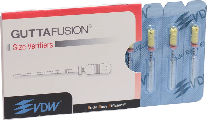 GUTTAFUSION® Size Verifier aus Nickel-Titan sind Bestandteil des GUTTAFUSION® Systems und ermöglichen die korrekte Auswahl des passenden GUTTAFUSION® Obturators. Sie sind u.a. ISO farbkodiert und röntgenopak.