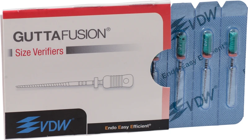 GUTTAFUSION® Size Verifier aus Nickel-Titan sind Bestandteil des GUTTAFUSION® Systems und ermöglichen die korrekte Auswahl des passenden GUTTAFUSION® Obturators. Sie sind u.a. ISO farbkodiert und röntgenopak.