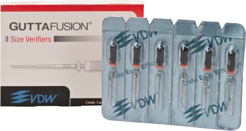 GUTTAFUSION® Size Verifier aus Nickel-Titan sind Bestandteil des GUTTAFUSION® Systems und ermöglichen die korrekte Auswahl des passenden GUTTAFUSION® Obturators. Sie sind u.a. ISO farbkodiert und röntgenopak.