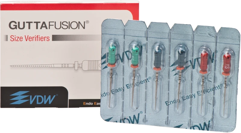GUTTAFUSION® Size Verifier aus Nickel-Titan sind Bestandteil des GUTTAFUSION® Systems und ermöglichen die korrekte Auswahl des passenden GUTTAFUSION® Obturators. Sie sind u.a. ISO farbkodiert und röntgenopak.