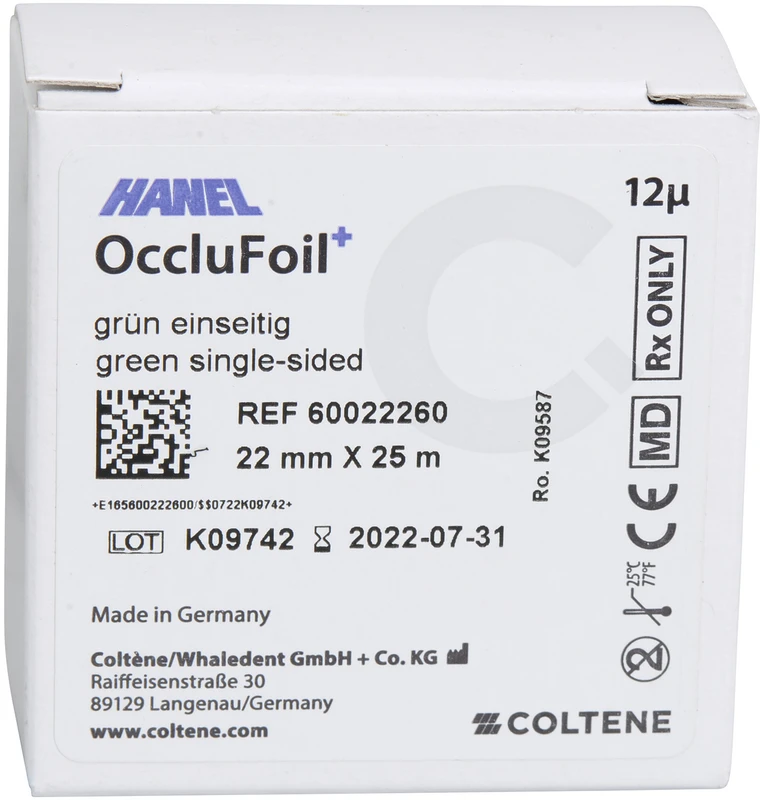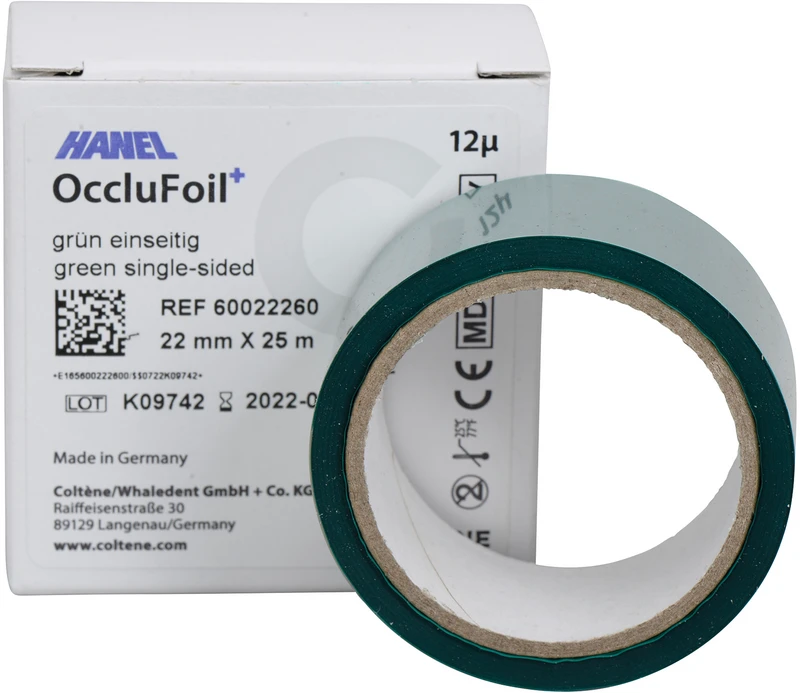Die HANEL OccluFoil+ erfüllt alle Ansprüche der modernen Gnathologie. Die Folie ist extrem dünn und zeichnet punktgenau.Die 22 mm breite Folie gibt es einseitig, doppelseitig-einfarbig und doppelseitig-zweifarbig. Hierfür gibt es den transparenten Kunststoffspender mit Abreißmesser. Die 80 mm breite Folie gibt es einseitig und doppelseitig-einfarbig; sie wird im praktischen Spenderkarton geliefert.