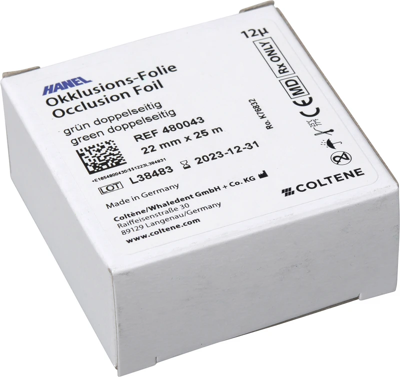 Die HANEL-Folie erfüllt alle Ansprüche der modernen Gnathologie. Die Folie ist extrem dünn und zeichnet punktgenau.Die 22 mm breite Folie gibt es einseitig, doppelseitig-einfarbig und doppelseitig-zweifarbig. Hierfür gibt es den transparenten Kunststoffspender mit Abreißmesser. Die 80 mm breite Folie gibt es einseitig und doppelseitig-einfarbig; sie wird im praktischen Spenderkarton geliefert.