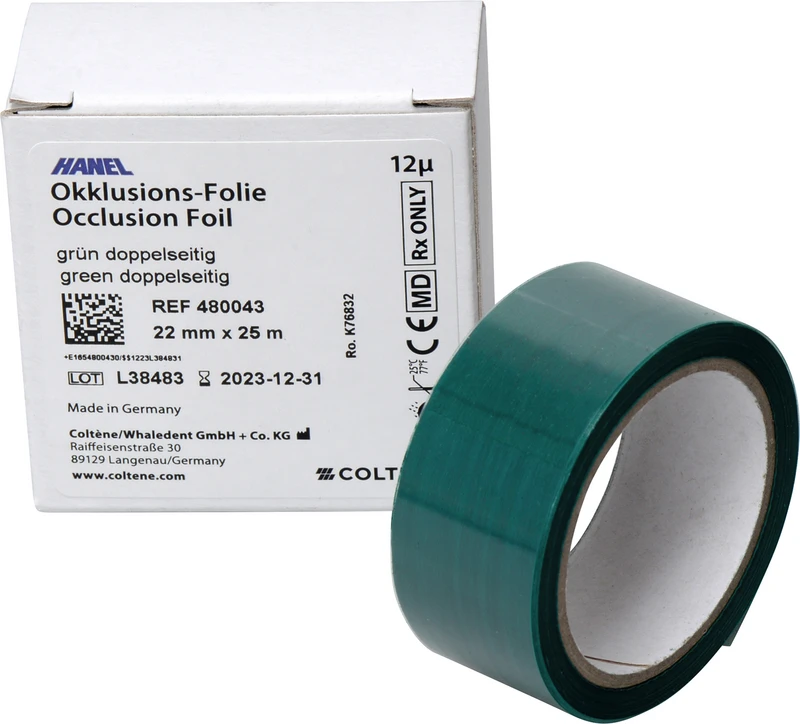 Produktinformationen "HANEL Occlusions-Folie, doppelseitig 12 µm Rolle 25 m grün, 22 mm breit"
