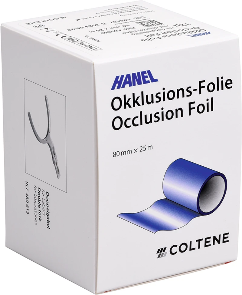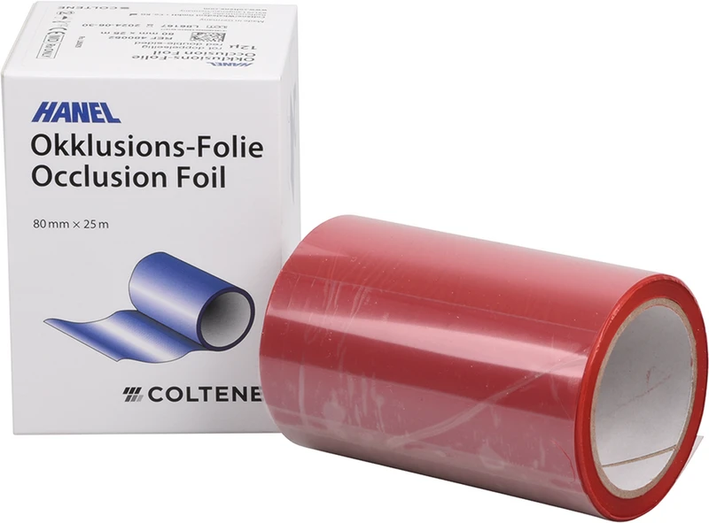 Die HANEL-Folie erfüllt alle Ansprüche der modernen Gnathologie. Die Folie ist extrem dünn und zeichnet punktgenau.Die 22 mm breite Folie gibt es einseitig, doppelseitig-einfarbig und doppelseitig-zweifarbig. Hierfür gibt es den transparenten Kunststoffspender mit Abreißmesser. Die 80 mm breite Folie gibt es einseitig und doppelseitig-einfarbig; sie wird im praktischen Spenderkarton geliefert.