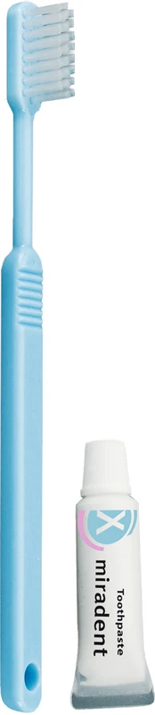 Zahnpflege-Reisebegleiter. Zahnbürste und 3 g Tube mit erfrischend minziger Zahnpasta. Zahnbürste und Tube hygienisch einzeln verpackt.