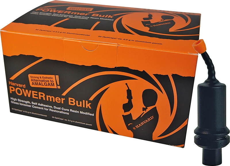 Harvard POWERmer Bulk ist ein starker, selbstadhäsiver, dualhärtender kunststoffmodifizierter Hochleistungs-Glasionomerzement für Restaurationen. Harvard POWERmer Bulk ist ein zahnfarbendes Bulk-Füllungsmaterial mit der hohen mechanischen Festigkeit und der Ästhetik eines Composites. Für die Anwendung wird kein Adhäsiv benötigt. Dies macht Harvard POWERmer Bulk zu einer idealen Alternative zu Amalgam.