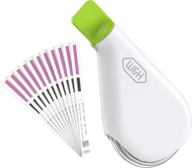 - Eine revolutionäre Rückverfolgbarkeit für Sterilisationstests: Jeder Streifen ist mit einem einzigartigen Matrixcode versehen, der eine eindeutige Zuordnung des chemischen Indikators zum Testzyklus ermöglicht. W&H verbessert auch die Möglichkeit, Fotos der Testergebnisse zu machen, um digitale Sterilisationslogbücher mit der neuen e-Log-Funktion von W&H zu erstellen