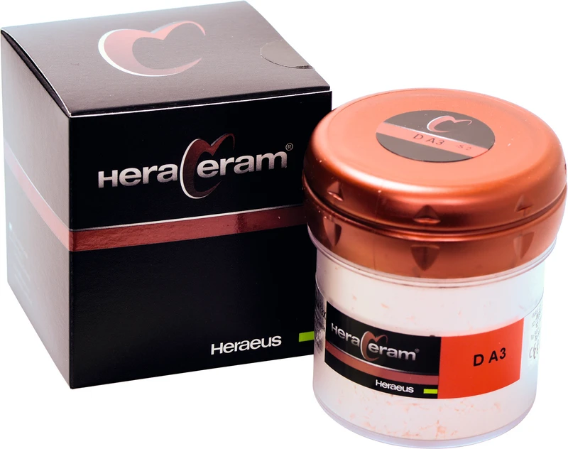 HeraCeram® ist die hochschmelzende Verblendkeramik für Aufbrennlegierungen in einem WAK-Bereich von 13,5 14,9 m/mK. Aufgrund der niedrigen Brenntemperaturen von maximal 880 C können alle Legierungen in diesem WAK-Bereich sicher verarbeitet werden. Zur ästhetischen Gestaltung bietet HeraCeram® neben optimal auf einander abgestimmte Opaker, Dentin- und Schneidemassen ein umfassendes Sortiment an Individualmassen. Sie erzielen auch bei geringen Schichtstärken zuverlässige Farbergebnisse. Die Standfestigkeit der Massen und der geringe Brennschrumpf sorgen für eine hohe Formstabilität der Verblendung. Mit einer dichten, extrem glatten Oberfläche schützt HeraCeram® den Antagonisten und sorgt für hohe Plaqueresistenz und Gingivafreundlichkeit.