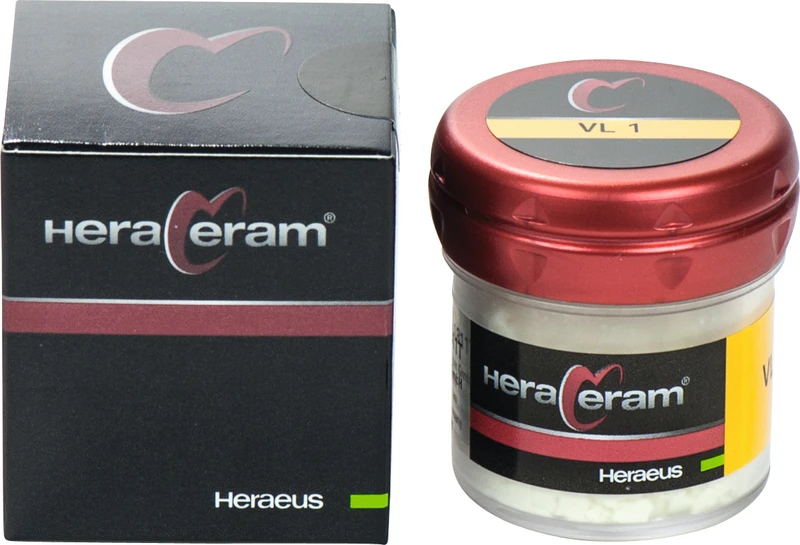 HeraCeram® ist die hochschmelzende Verblendkeramik für Aufbrennlegierungen in einem WAK-Bereich von 13,5 14,9 m/mK. Aufgrund der niedrigen Brenntemperaturen von maximal 880 C können alle Legierungen in diesem WAK-Bereich sicher verarbeitet werden. Zur ästhetischen Gestaltung bietet HeraCeram® neben optimal auf einander abgestimmte Opaker, Dentin- und Schneidemassen ein umfassendes Sortiment an Individualmassen. Sie erzielen auch bei geringen Schichtstärken zuverlässige Farbergebnisse. Die Standfestigkeit der Massen und der geringe Brennschrumpf sorgen für eine hohe Formstabilität der Verblendung. Mit einer dichten, extrem glatten Oberfläche schützt HeraCeram® den Antagonisten und sorgt für hohe Plaqueresistenz und Gingivafreundlichkeit.