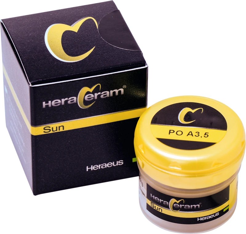 HeraCeram® Sun ist die niedrigschmelzende Keramiklinie im HeraCeram System. Sie deckt den WAK-Bereich v on 15,7-16,7 µm/mK zuverlässig ab. Die niedrigen Brenntemperaturen von maximal 790 °C gewährleisten eine sichere Verarbeitung niedrigschmelzender Legierungen. Damit ist HeraCeram® Sun optimal auf die HeraSun- und Universal-Legierungen von Heraeus abgestimmt.