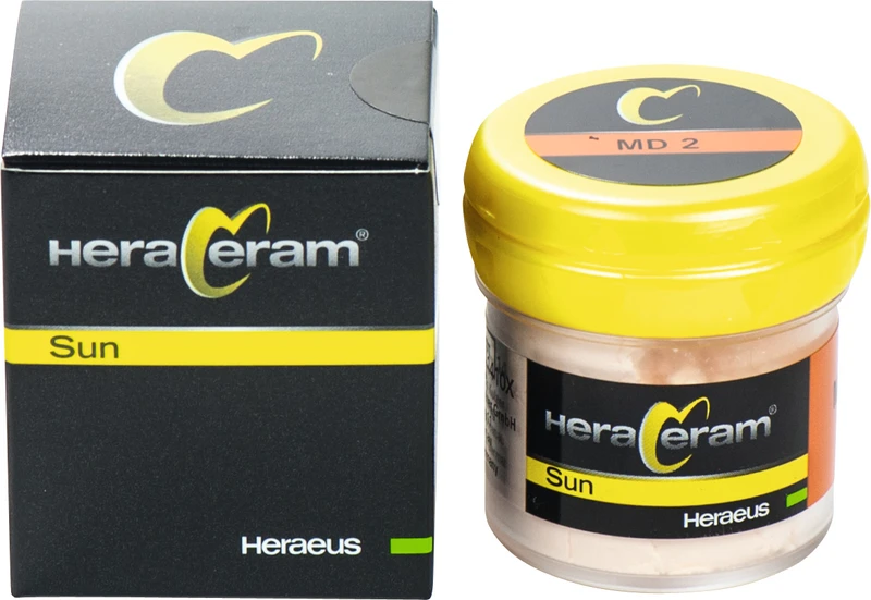 HeraCeram® Sun ist die niedrigschmelzende Keramiklinie im HeraCeram System. Sie deckt den WAK-Bereich v on 15,7-16,7 µm/mK zuverlässig ab. Die niedrigen Brenntemperaturen von maximal 790 °C gewährleisten eine sichere Verarbeitung niedrigschmelzender Legierungen. Damit ist HeraCeram® Sun optimal auf die HeraSun- und Universal-Legierungen von Heraeus abgestimmt.