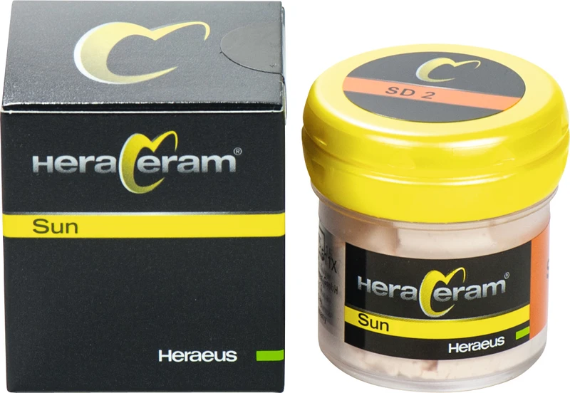 HeraCeram® Sun ist die niedrigschmelzende Keramiklinie im HeraCeram System. Sie deckt den WAK-Bereich v on 15,7-16,7 µm/mK zuverlässig ab. Die niedrigen Brenntemperaturen von maximal 790 °C gewährleisten eine sichere Verarbeitung niedrigschmelzender Legierungen. Damit ist HeraCeram® Sun optimal auf die HeraSun- und Universal-Legierungen von Heraeus abgestimmt.