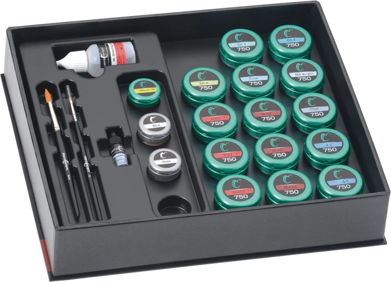 Kit Touch 3 ml Adhesive, 2 ml body stain BS-A, 2 ml Glaze universal, 3 x 20 g dentin (DA2, DA3, DA3,5), 3 x 20 g increaser (INA2, INA3, INA3,5), 2 x 20 g schneide (S1, S2), 2 x 20 g enhancer (EHA, EHneutral), 20 g mask MAbright, 2 x 20 g opal-Massen (OS2, OT2), 20 g Korrekturmasse COR, 2 ml Stain liquid universal SLU, 25 ml Modellierflüssigkeit ML, 1 Modellierpinsel Toray, 1 Glasurpinsel, 1 Farbindikator