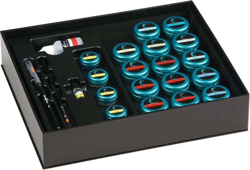 Set First touch 1 ml NP-Primer, 3 x 2 ml Pastenopaker PO (A2, A3, A3,5), 3 x 20 g Dentin D (A2, A3, A3,5), 3 x 20 g Increaser IN (A2, A3, A3,5) 2 x 20 g Schneide S1 (S2I), 2 x 20 g Enhancer EH (A, neutral), 20 g Mask MA bright, 2 x 20 g Opalmassen OS 2 (OT 2), 20 g Schultermasse LM 2, 1 ml Pastenopakerliquid POL, 25 ml Modellierflüssigkeit ML, Pastenopakerpinsel PO, Modellierpinsel Toray, Farbindikator