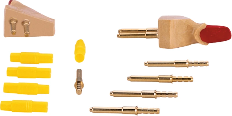 Die Heraeus Pins sind sehr schlank, kurz und können auch bei schmalen Segmenten eingesetzt werden. Stufenpins mit Kunststoffhülse erleichtern wesentlich die Erstentnahme des Zahnkranzes vom Gipssockel. Konische Pins eignen sich für häufige Entnahme des Sägestumpfes.