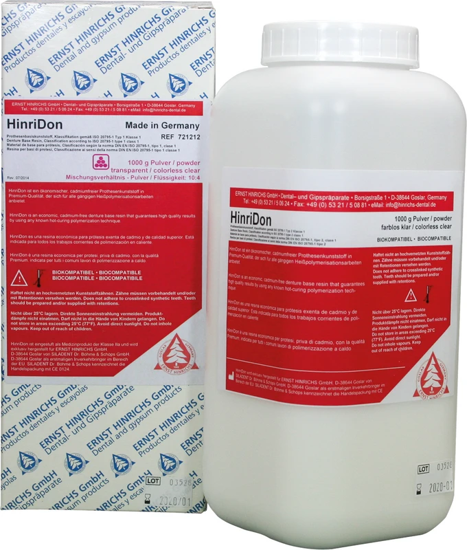 HinriDon ist ein ökonomischer, cadmiumfreier Prothesenkunststoff in Premiumqualiät, der für alle gängigen Heisspolymerisationen einsetzbar ist.