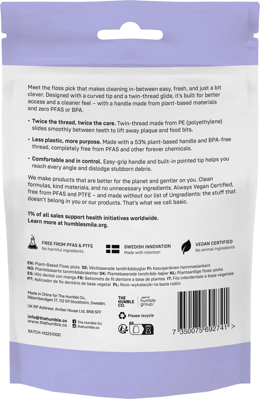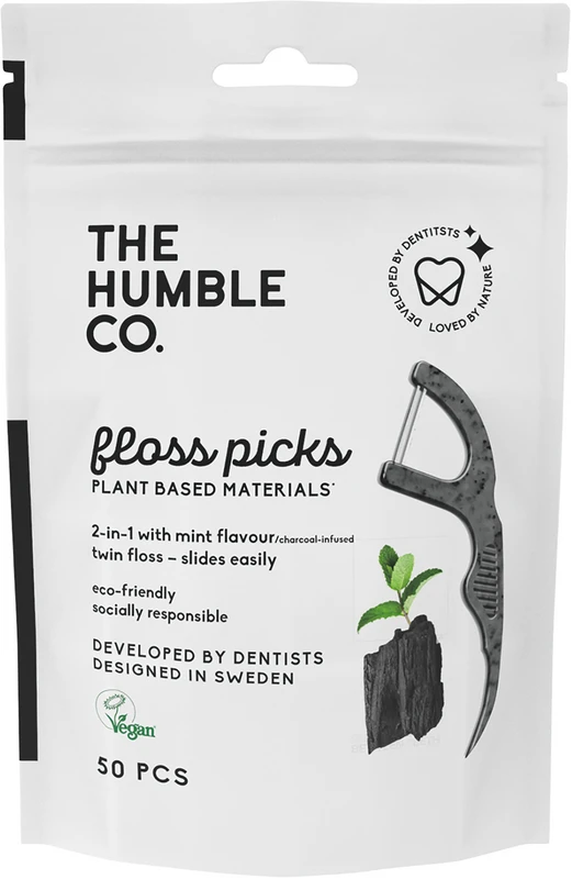 Humble Floss Picks sind Zahnstocher und Zahnseide in einem. Der ergonomische Griff auf Pflanzenbasis mit integriertem Zahnstocher ermöglicht die gründliche Reinigung der Zahnzwischenräume auch an schwer zugänglichen Stellen. Die innovative doppelte Fadenführung mit leicht strukturierter Oberfläche sorgt dafür, dass Speisereste effektiv entfernt werden. Humble Floss Picks haben einen frischen Minzgeschmack und sind mit oder ohne Zusatz von Aktivkohle für natürliche Zahnaufhellung erhältlich. Mit einer Verpackung aus recyceltem Papier und der Verwendung von nachwachsenden Rohstoffen wird jetzt auch die Pflege der Zahnzwischenräume zu einem nachhaltigen Erlebnis.