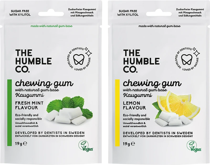 Humble Zahnkaugummis sind zuckerfrei und bestehen ausschließlich aus natürlichen Inhaltsstoffen. Während in herkömmlichen Kaugummis zumeist synthetische Rohstoffe und Gummi aus Polymeren auf Erdölbasis zum Einsatz kommen, wird für Humble Zahnkaugummis die Gummibasis Chicle aus dem Sapotillbaum verwendet. Endlich keinen Kunststoff mehr kauen! Wo herkömmliche Kaugummis oft jahrzehntelang unsere Natur verschmutzen, ist Humble Zahnkaugummi vollständig biologisch abbaubar. Es ist außerdem frei von Gentechnik (GVO) und Aspartam, enthält weder künstliche Farb- und Aromastoffe noch Konservierungsmittel und schmeckt dabei noch großartig. Xylit pflegt den Mund und ist wirksam gegen Karies und Plaque.