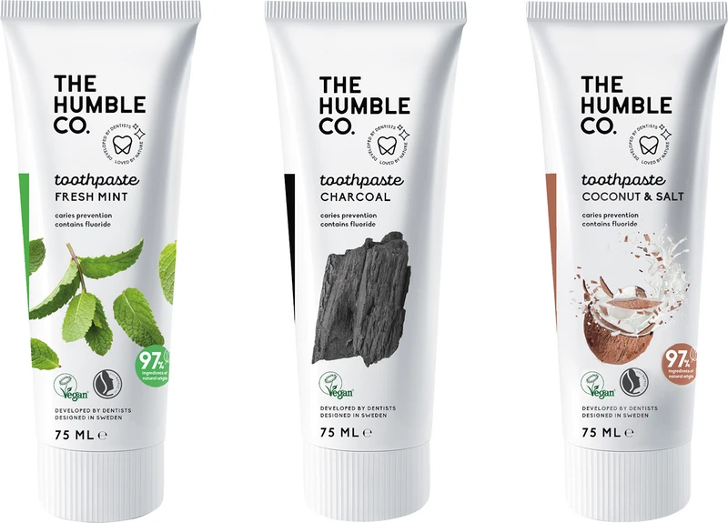 Humble Zahnpasta schützt und reinigt wie andere Zahnpasta, verwendet dabei aber nahezu ausschließlich natürliche, unbedenkliche Inhaltsstoffe. Humble Zahnpasta enthält keine Farbstoffe, künstlichen Aromastoffe, Konservierungsmittel oder Schaumbildner (SLS) und ist frei von Mikroplastik. Sie schützt vor Karies, Zahnfleischbluten, Mundgeruch, Plaque und Parodontose und enthält Natriumfluorid zur Stärkung des Zahnschmelzes (1.450 ppm). Die Tuben werden mit der patentierten Albéa Greenleaf® Technologie hergestellt. Dieses umweltfreundliche und ressourcenschonende Verpackungsverfahren ermöglicht auch die Anwendung von besonders dünnem, recyceltem Verpackungsmaterial.