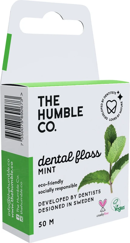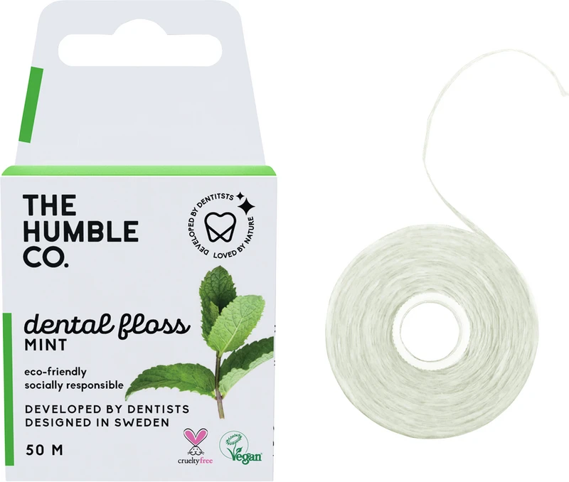 Humble Zahnseide besteht aus reißfestem, leicht strukturiertem Nylonfaden, beschichtet mit Candelillawachs und natürlichem Xylit. Die Verpackung aus recyceltem Papier dient gleichzeitig als Spender.