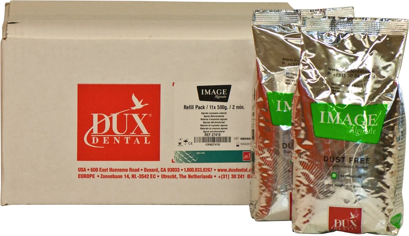 IMAGE Alginate ist staubfrei, sehr glatt, cremig und einfach sowohl per Hand als auch maschinell anzumischen. Die grüne Farbe macht Abdruckdetails einfach zu lesen. IMAGE Alginate hat einen frischen Minzgeschmack und ist 100 % biologisch abbaubar und bleibt 4 Tage (100 Stunden) stabil und formfest. NH = 3 Minuten, SH = 2 Minuten.