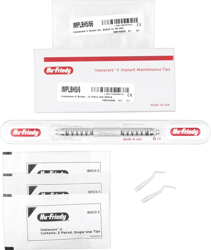 Implacare II - hart zu Ablagerungen, sanft zu Implantaten und Prothesen. Die Scaler der Reihe Implacare II, Hu-Friedys neuester Entwicklung zur Implantatreinigung, verfügen über eine 20 % dünnere Spitze und eine neue Form zur besseren Anpassung an das Implantat. So können Implantate unter möglichst geringer Veränderung der Abutment-Oberfläche effektiv gereinigt werden. Die Einwegspitzen sind aus Plasteel gefertigt, einem hochwertigen Kunstharz, welcher Titan nicht angreift. Plasteel-Instrumente sollten vor der Verwendung im Autoklav sterilisiert werden. Der leichtgewichtige Satin Steel Griff ist ergonomisch geformt für eine optimale Balance und Kontrolle und sorgt dank Rändeldesign für einen sicheren Griff.