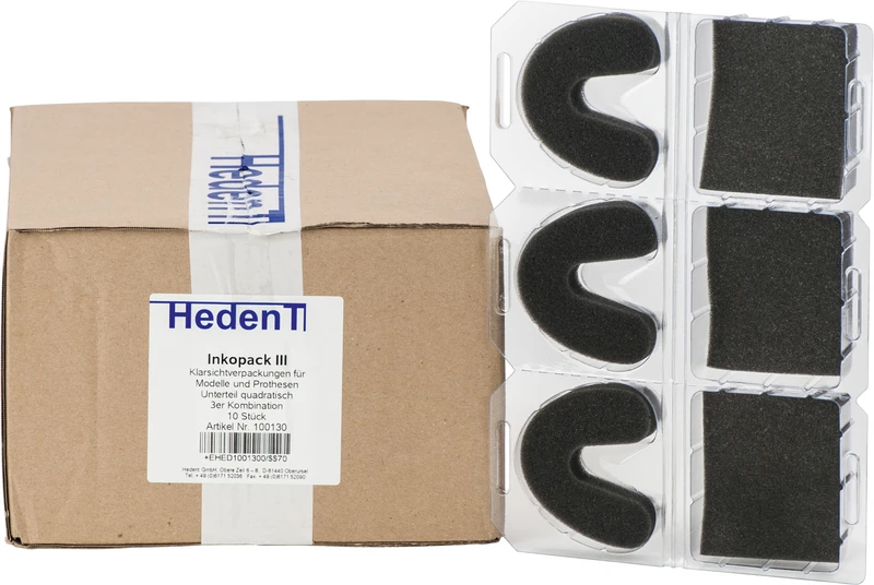Klarsichtverpackungen für Modelle und Prothesen. Im Hedent Inkopack sind Abdrücke, Gipsmodelle und Zahnprothesen für den Transport schnell und sicher verpackt. Die Klarsichtverpackung vermittelt den zahntechnischen Arbeiten einen hervorragenden optischen Eindruck. Hedent Inkopack ist stapelbar und für Lagerung von kieferorthopädischen Modellen bestens geeignet.