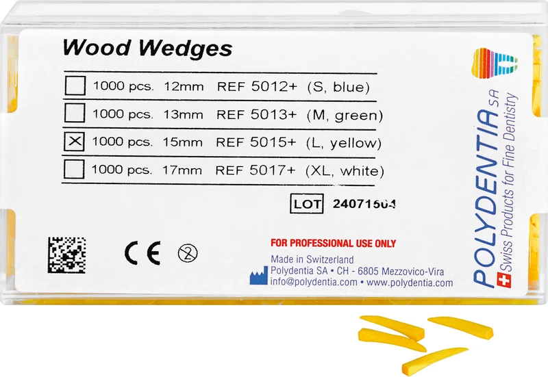 Hergestellt mit zertifiziertem Ahornholz aus naturnah bewirtschafteten Wäldern, gestatten diese Interdentalkeile eine optimale Anpassung der Matrize an die zervikale Stufe des Zahns. Einzeln und sorgfältig vorbereitet, sind sie einer einwandfreien Endbearbeitung unterzogen. Verschiedene Größen: XS für die Kinderzahnmedizin, XL für die Parodontologie. Die XL-Keilchen sind nicht in der assortierten Packung enthalten.Box