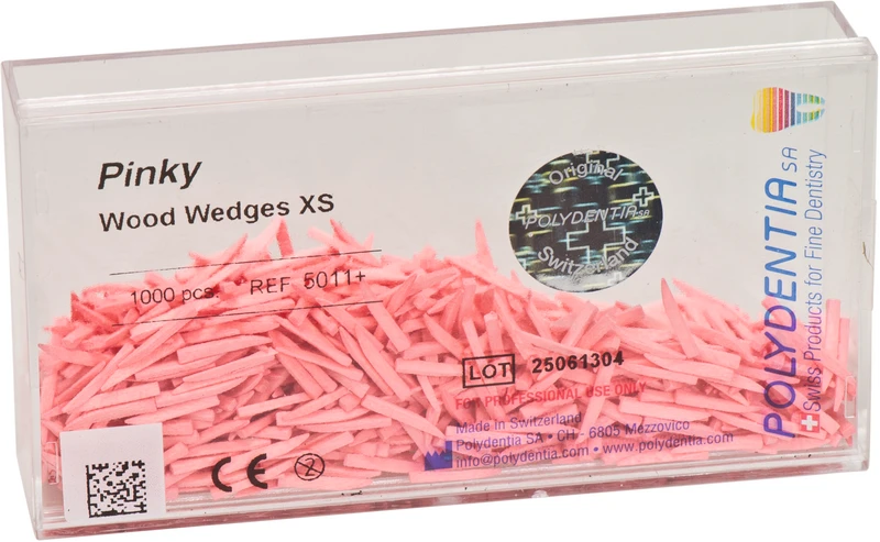 Hergestellt mit zertifiziertem Ahornholz aus naturnah bewirtschafteten Wäldern, gestatten diese Interdentalkeile eine optimale Anpassung der Matrize an die zervikale Stufe des Zahns. Einzeln und sorgfältig vorbereitet, sind sie einer einwandfreien Endbearbeitung unterzogen. Verschiedene Größen: XS für die Kinderzahnmedizin, XL für die Parodontologie. Die XL-Keilchen sind nicht in der assortierten Packung enthalten.Box