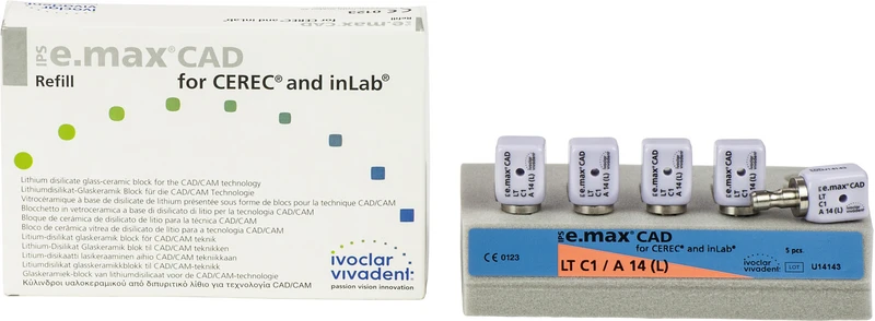 Die IPS e.max CAD for CEREC/inLab ist eine hochfeste Lithiumdisilikat-Vollkeramik, mit idealen ästhetischen Eigenschaften. Die Keramikblocks sind optimal für die Herstellung von vollanatomischen Kronen, Inlays und Veneers geeignet und werden im inLab-System oder CEREC-System (Sirona) verarbeitet. Die Blocks sind in unkristallisiertem Zustand bläulich und leicht bearbeitbar. Nach dem Kristallisationsbrand ist die Keramik zahnfarben und hochfest. IPS e.max Kronen aus CAD LT können selbstadhäsiv oder konventionell befestigt werden.