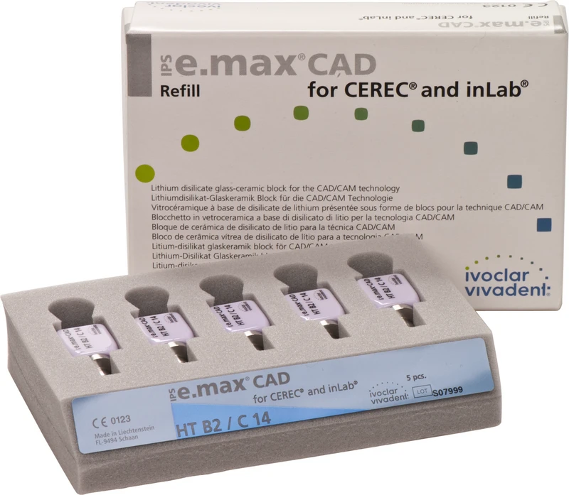 Die IPS e.max CAD for CEREC/inLab ist eine hochfeste Lithiumdisilikat-Vollkeramik, mit idealen ästhetischen Eigenschaften. Die Keramikblocks sind optimal für die Herstellung von vollanatomischen Kronen, Inlays und Veneers geeignet und werden im inLab-System oder CEREC-System (Sirona) verarbeitet. Die Blocks sind in unkristallisiertem Zustand bläulich und leicht bearbeitbar. Nach dem Kristallisationsbrand ist die Keramik zahnfarben und hochfest. IPS e.max Kronen aus CAD LT können selbstadhäsiv oder konventionell befestigt werden.