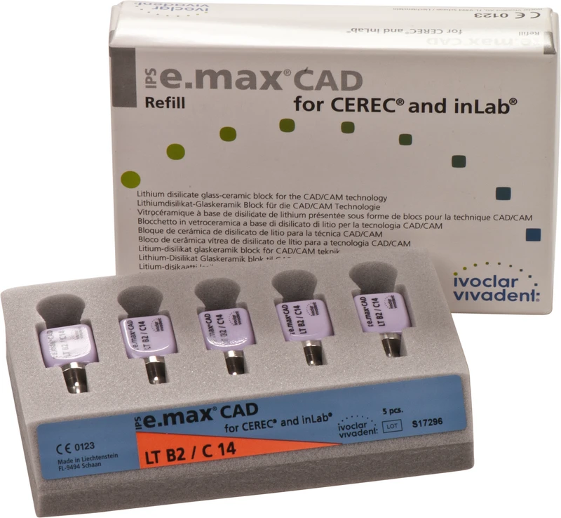 Die IPS e.max CAD for CEREC/inLab ist eine hochfeste Lithiumdisilikat-Vollkeramik, mit idealen ästhetischen Eigenschaften. Die Keramikblocks sind optimal für die Herstellung von vollanatomischen Kronen, Inlays und Veneers geeignet und werden im inLab-System oder CEREC-System (Sirona) verarbeitet. Die Blocks sind in unkristallisiertem Zustand bläulich und leicht bearbeitbar. Nach dem Kristallisationsbrand ist die Keramik zahnfarben und hochfest. IPS e.max Kronen aus CAD LT können selbstadhäsiv oder konventionell befestigt werden.