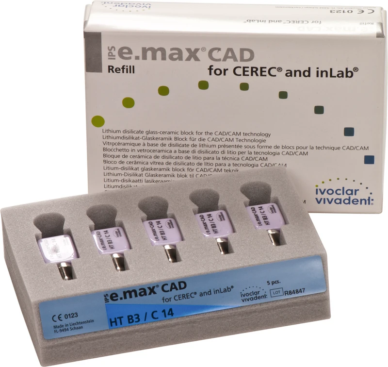 Die IPS e.max CAD for CEREC/inLab ist eine hochfeste Lithiumdisilikat-Vollkeramik, mit idealen ästhetischen Eigenschaften. Die Keramikblocks sind optimal für die Herstellung von vollanatomischen Kronen, Inlays und Veneers geeignet und werden im inLab-System oder CEREC-System (Sirona) verarbeitet. Die Blocks sind in unkristallisiertem Zustand bläulich und leicht bearbeitbar. Nach dem Kristallisationsbrand ist die Keramik zahnfarben und hochfest. IPS e.max Kronen aus CAD LT können selbstadhäsiv oder konventionell befestigt werden.