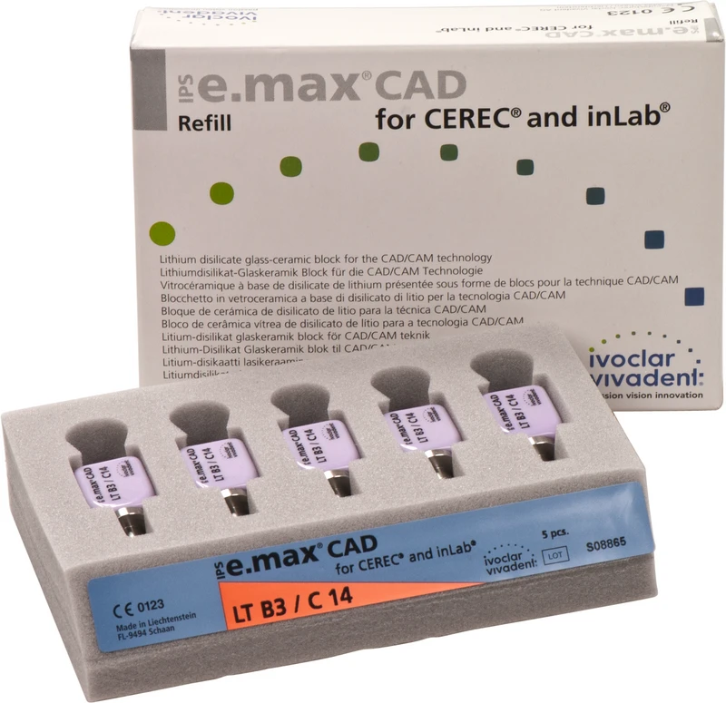 Die IPS e.max CAD for CEREC/inLab ist eine hochfeste Lithiumdisilikat-Vollkeramik, mit idealen ästhetischen Eigenschaften. Die Keramikblocks sind optimal für die Herstellung von vollanatomischen Kronen, Inlays und Veneers geeignet und werden im inLab-System oder CEREC-System (Sirona) verarbeitet. Die Blocks sind in unkristallisiertem Zustand bläulich und leicht bearbeitbar. Nach dem Kristallisationsbrand ist die Keramik zahnfarben und hochfest. IPS e.max Kronen aus CAD LT können selbstadhäsiv oder konventionell befestigt werden.