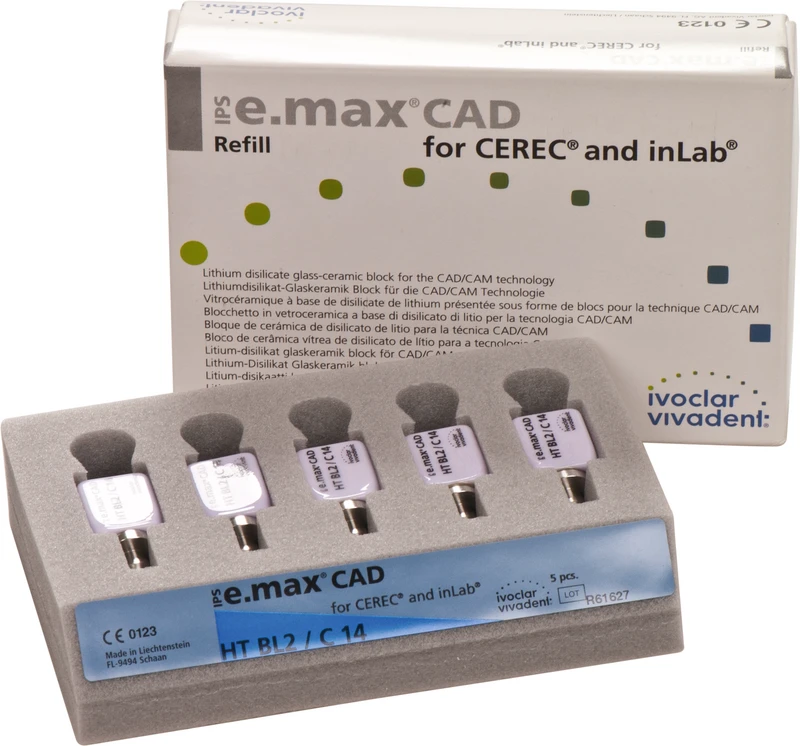 Die IPS e.max CAD for CEREC/inLab ist eine hochfeste Lithiumdisilikat-Vollkeramik, mit idealen ästhetischen Eigenschaften. Die Keramikblocks sind optimal für die Herstellung von vollanatomischen Kronen, Inlays und Veneers geeignet und werden im inLab-System oder CEREC-System (Sirona) verarbeitet. Die Blocks sind in unkristallisiertem Zustand bläulich und leicht bearbeitbar. Nach dem Kristallisationsbrand ist die Keramik zahnfarben und hochfest. IPS e.max Kronen aus CAD LT können selbstadhäsiv oder konventionell befestigt werden.