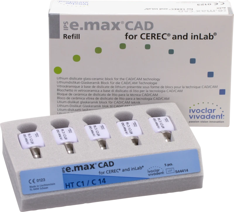 Die IPS e.max CAD for CEREC/inLab ist eine hochfeste Lithiumdisilikat-Vollkeramik, mit idealen ästhetischen Eigenschaften. Die Keramikblocks sind optimal für die Herstellung von vollanatomischen Kronen, Inlays und Veneers geeignet und werden im inLab-System oder CEREC-System (Sirona) verarbeitet. Die Blocks sind in unkristallisiertem Zustand bläulich und leicht bearbeitbar. Nach dem Kristallisationsbrand ist die Keramik zahnfarben und hochfest. IPS e.max Kronen aus CAD LT können selbstadhäsiv oder konventionell befestigt werden.