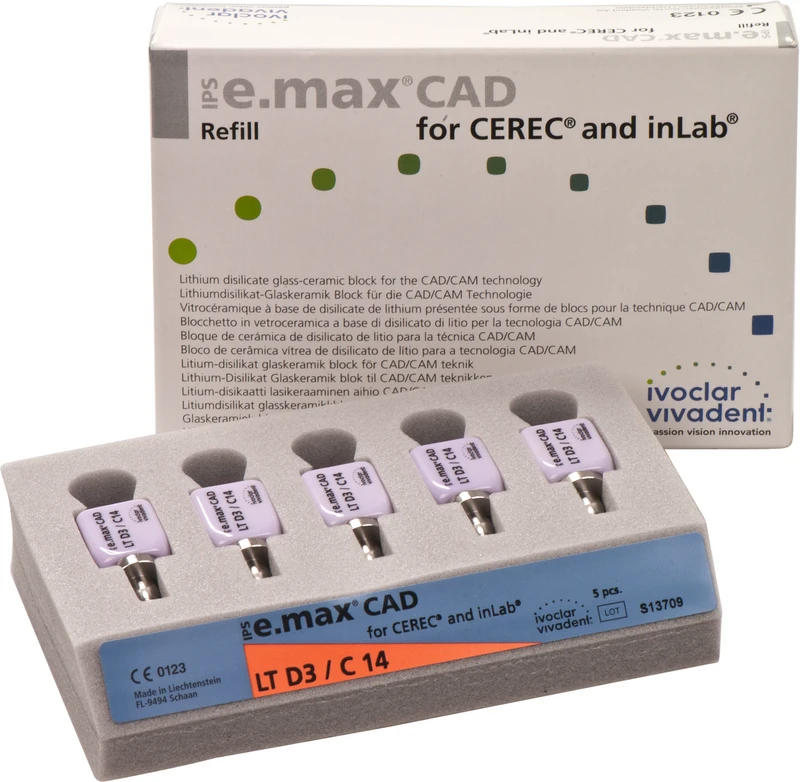 Die IPS e.max CAD for CEREC/inLab ist eine hochfeste Lithiumdisilikat-Vollkeramik, mit idealen ästhetischen Eigenschaften. Die Keramikblocks sind optimal für die Herstellung von vollanatomischen Kronen, Inlays und Veneers geeignet und werden im inLab-System oder CEREC-System (Sirona) verarbeitet. Die Blocks sind in unkristallisiertem Zustand bläulich und leicht bearbeitbar. Nach dem Kristallisationsbrand ist die Keramik zahnfarben und hochfest. IPS e.max Kronen aus CAD LT können selbstadhäsiv oder konventionell befestigt werden.