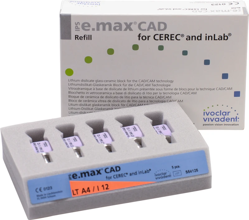 Die IPS e.max CAD for CEREC/inLab ist eine hochfeste Lithiumdisilikat-Vollkeramik, mit idealen ästhetischen Eigenschaften. Die Keramikblocks sind optimal für die Herstellung von vollanatomischen Kronen, Inlays und Veneers geeignet und werden im inLab-System oder CEREC-System (Sirona) verarbeitet. Die Blocks sind in unkristallisiertem Zustand bläulich und leicht bearbeitbar. Nach dem Kristallisationsbrand ist die Keramik zahnfarben und hochfest. IPS e.max Kronen aus CAD LT können selbstadhäsiv oder konventionell befestigt werden.