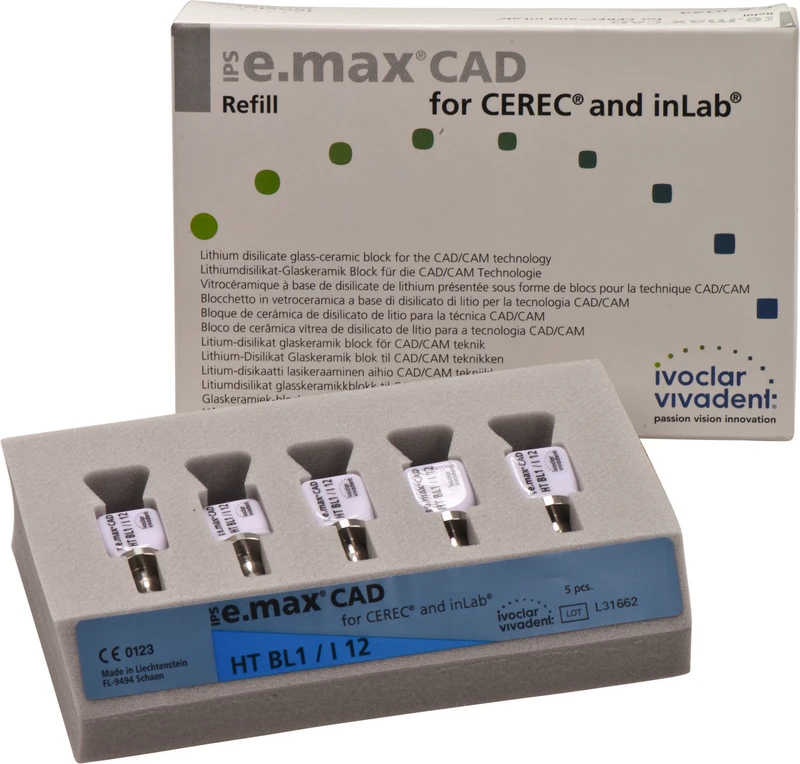 Die IPS e.max CAD for CEREC/inLab ist eine hochfeste Lithiumdisilikat-Vollkeramik, mit idealen ästhetischen Eigenschaften. Die Keramikblocks sind optimal für die Herstellung von vollanatomischen Kronen, Inlays und Veneers geeignet und werden im inLab-System oder CEREC-System (Sirona) verarbeitet. Die Blocks sind in unkristallisiertem Zustand bläulich und leicht bearbeitbar. Nach dem Kristallisationsbrand ist die Keramik zahnfarben und hochfest. IPS e.max Kronen aus CAD LT können selbstadhäsiv oder konventionell befestigt werden.