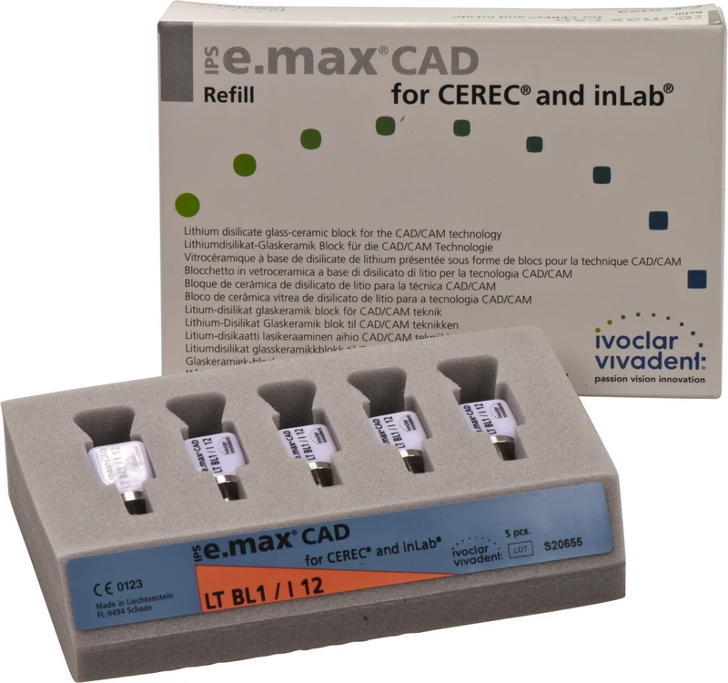 Die IPS e.max CAD for CEREC/inLab ist eine hochfeste Lithiumdisilikat-Vollkeramik, mit idealen ästhetischen Eigenschaften. Die Keramikblocks sind optimal für die Herstellung von vollanatomischen Kronen, Inlays und Veneers geeignet und werden im inLab-System oder CEREC-System (Sirona) verarbeitet. Die Blocks sind in unkristallisiertem Zustand bläulich und leicht bearbeitbar. Nach dem Kristallisationsbrand ist die Keramik zahnfarben und hochfest. IPS e.max Kronen aus CAD LT können selbstadhäsiv oder konventionell befestigt werden.