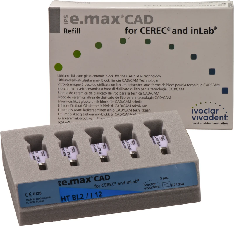 Die IPS e.max CAD for CEREC/inLab ist eine hochfeste Lithiumdisilikat-Vollkeramik, mit idealen ästhetischen Eigenschaften. Die Keramikblocks sind optimal für die Herstellung von vollanatomischen Kronen, Inlays und Veneers geeignet und werden im inLab-System oder CEREC-System (Sirona) verarbeitet. Die Blocks sind in unkristallisiertem Zustand bläulich und leicht bearbeitbar. Nach dem Kristallisationsbrand ist die Keramik zahnfarben und hochfest. IPS e.max Kronen aus CAD LT können selbstadhäsiv oder konventionell befestigt werden.