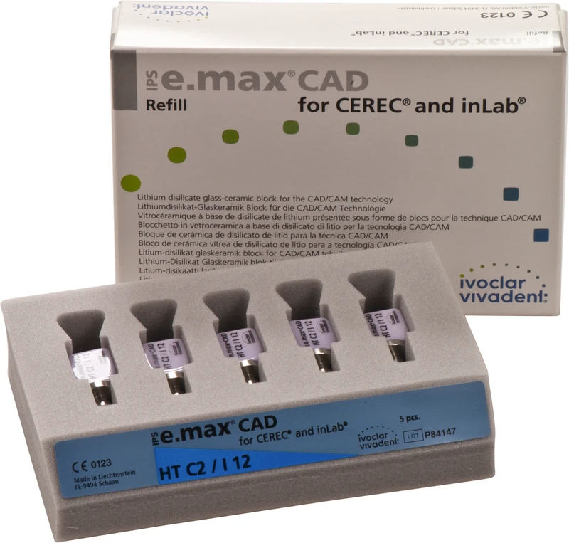 Die IPS e.max CAD for CEREC/inLab ist eine hochfeste Lithiumdisilikat-Vollkeramik, mit idealen ästhetischen Eigenschaften. Die Keramikblocks sind optimal für die Herstellung von vollanatomischen Kronen, Inlays und Veneers geeignet und werden im inLab-System oder CEREC-System (Sirona) verarbeitet. Die Blocks sind in unkristallisiertem Zustand bläulich und leicht bearbeitbar. Nach dem Kristallisationsbrand ist die Keramik zahnfarben und hochfest. IPS e.max Kronen aus CAD LT können selbstadhäsiv oder konventionell befestigt werden.